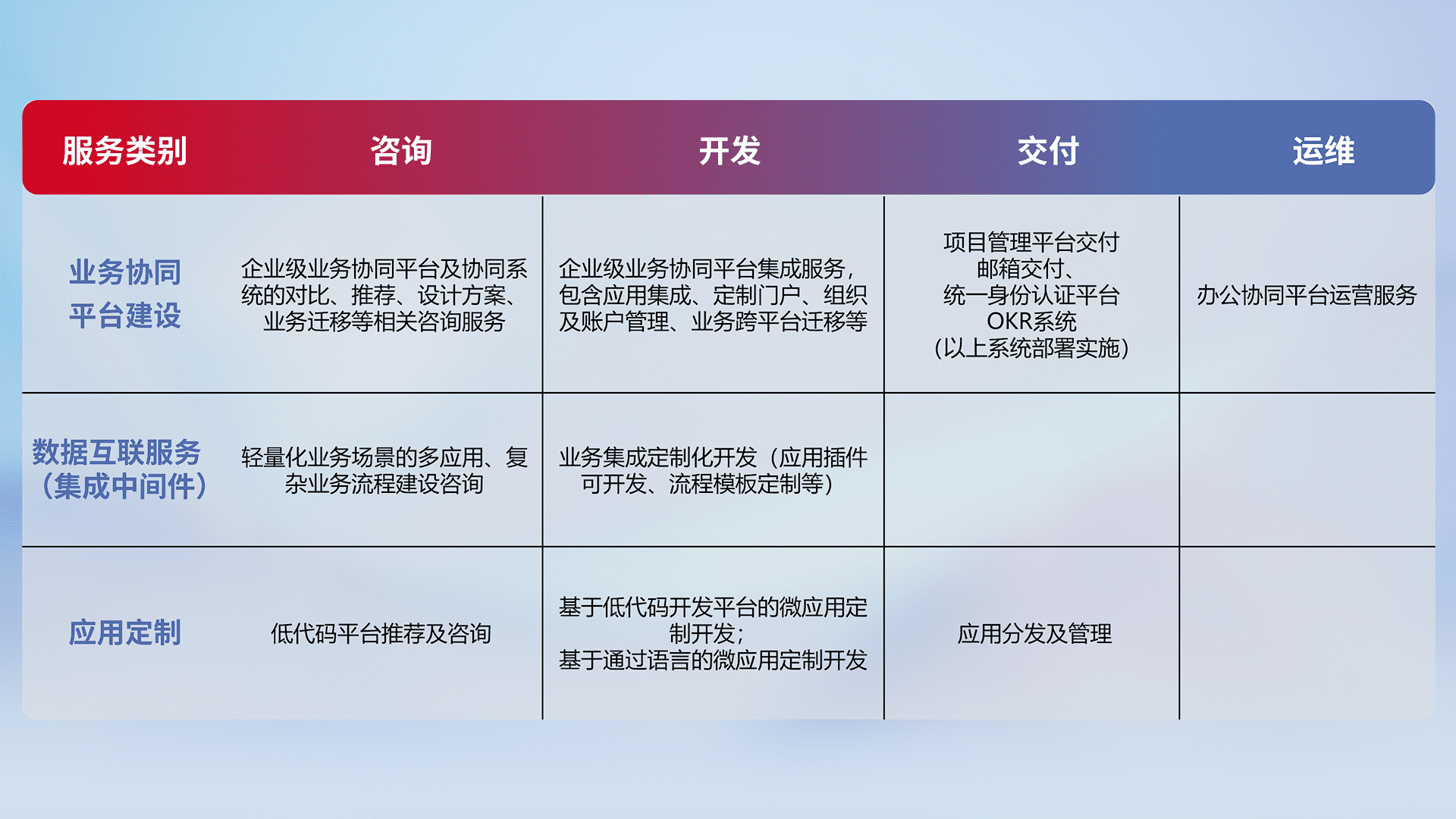 针对钉钉、、、、企微、、、IDaas等平台级产品提供产品的规划、、方案、、交付、、定制化开发等服务,,实现如统一协同办公、、、智能客户服务、、、、混合会议管理、、、、智能数据查询、、、等业务场景,,,,实现数字化转型。。。。