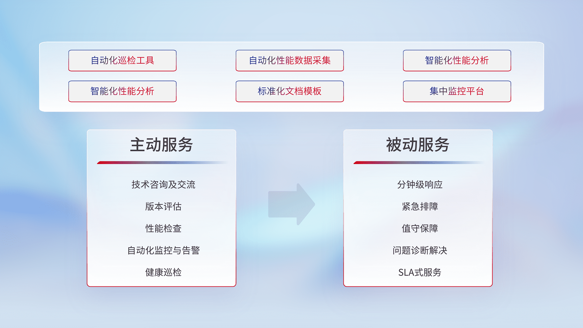 智能化工具和标准化文档,,,,保障服务质量,,提供主动服务(包含技术咨询、、、、版本评估、、性能检查、、、自动化监控与告警、、、健康巡检)和被动服务包含(分钟级响应、、紧急排障、、、值守保障、、、、问题诊断解决、、、SLA服务)。。
